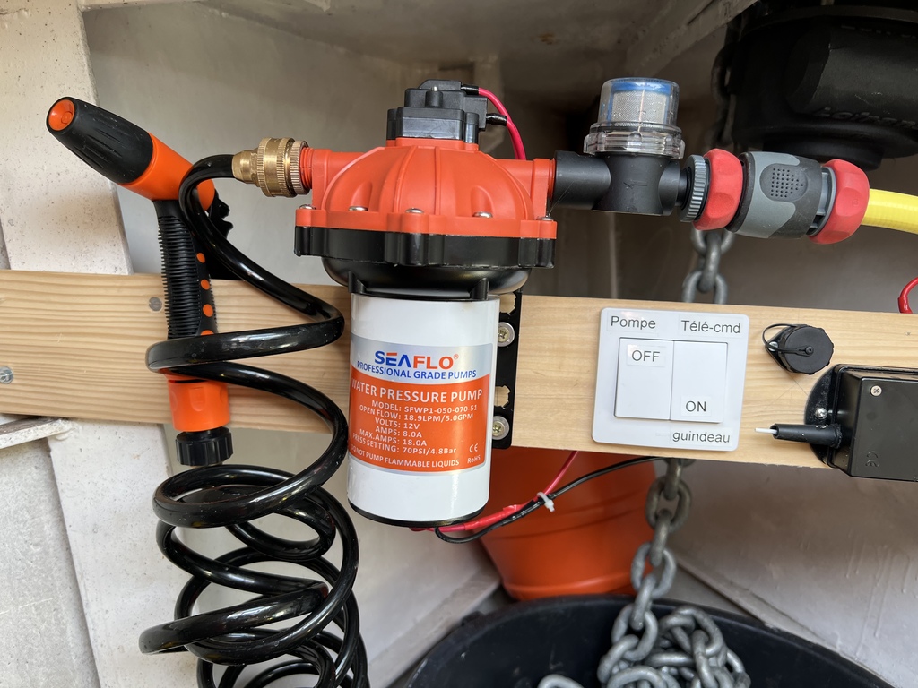 Bonjour, je relance ce fil car j'aimerai avoir une pompe 12v avec suffisamment de débit et de pression pour nettoyer la vase de la chaîne et de l'ancre, qu'avez vous à bord (marque, puissance, débit) et en êtes vous satisfait ?