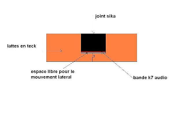 pour commencer, une chose toute simple pour realiser des joints durables: une fois que tu as bien enlevé l'ancien joint il faut poser au fond de la rainure un "isolant", en general de la bande de k7 audio qui ne coute pas grand chose, et offre une reconversion honorable aux k7 de tino rossi dont tu ne sais pas quoi faire, serieusement cela a pour effet de diminuer les tensions de cisaillement du joint car les efforts de cisaillement donc porterons sur les bords du joint et non surtoute la surface de contact de ce dernier avec les lattes, regarde le schema joint, ensuite concernant l'entretient du pont, une fois jointé, j'utilise du sel d'oseille (Acide oxalique) de la maniere suivante, deux a trois fois par an je frotte le pont avec un balai brosse souple (celui pour nettoyer les voitures) perpendiculairement a la fibre du bois, cela redonne sa couleur dorée au bois, et tue les moisissures, ensuite des que je suis en mer, un bon coup d'eau salée, j'evite au maximum l'eau douce qui elle fait pourrir le teck en favorisant l'apparition de mousses aux endroits innacessibles... mon pont est superbe, je ne l'ai jamais vernis ni huilé.