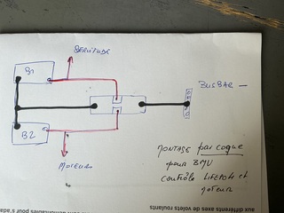 - quelque soit le choix, tu peux relier les -batteries moteurs sur un bus bar commun avec les - des lifepo4