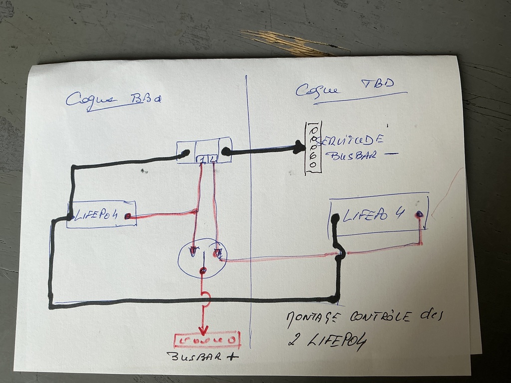 Et si, et si, sachant que ma masse est déjà connectée entre les deux coques, je laisse connecté le gros switch pour relier les deux (+) des LiFePo4, et que je connecte les B1 et B2 comme indiqué sur le schéma (modifié) ci joint .... est-ce que ça le ferait ???