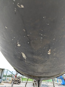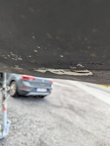 J'ai bouché un trou de passe coque il y a 2 ans. En sortant mon bateau de l'eau je découvre que le mastic que j'avais placé au dessus et autour de ma réparation en fibre de verre a tendance à se détacher du gelcoat (cfr photo). L'intérieur est sec, la réparation semble tenir.