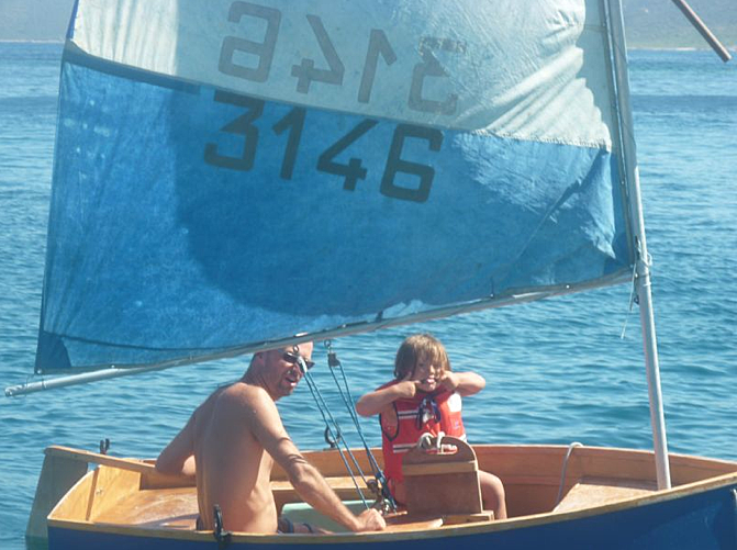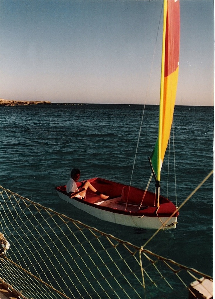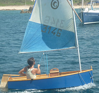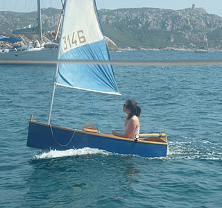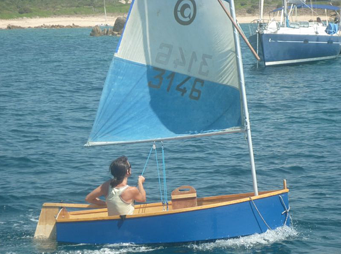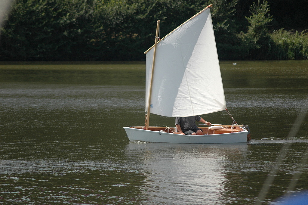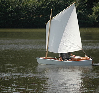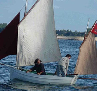Comme gréement c'est un mât de planche à voile, avec haubans et étai rajoutés et la voile, une voile de planche retaillée, pour installation d'une bôme.