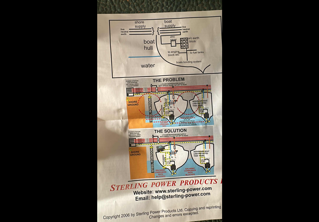 Voici le schéma fournie avec l’isolateur galvanique que j’ai installé. Il montre que tout est relié à une pièce immergée nommée ANODE