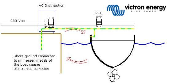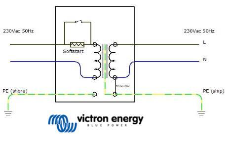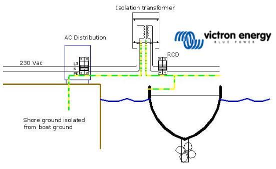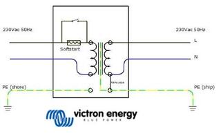 Comme l'explicite clairement les images du document VICTRON relatif au transformateur d'Isolement (ci-joints), la "Terre" (de la borne de quai) ne doit pas être raccordée à la "Masse" du navire .!.