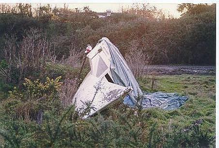 Mon proto des années 80 sur la Rance. Flotteur de catamaran = deux flotteurs à partir de kayak de descente.