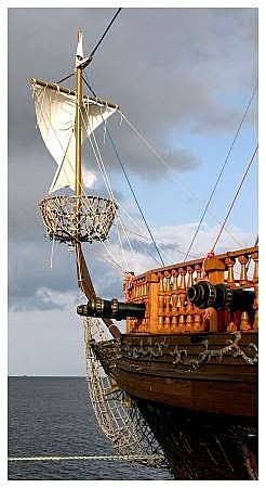 à la marine en bois, avec cage à poules sur le pont et viande sur pied dans l'entrepont...