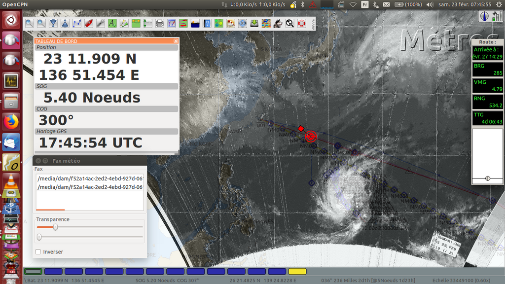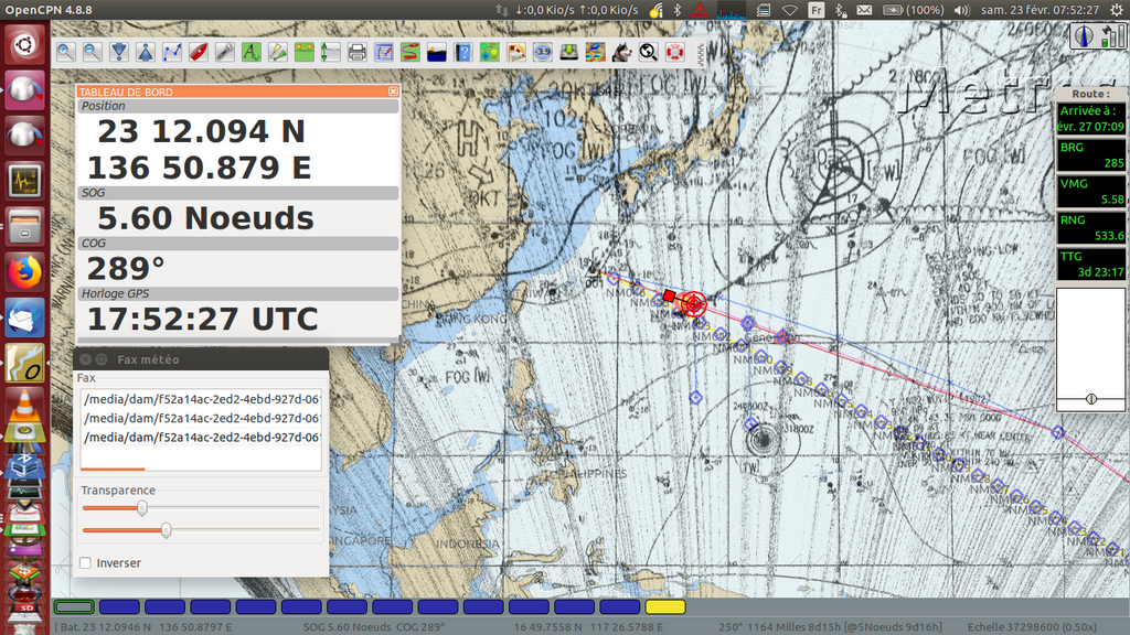 Comme le dis ED850 je ne m'arrête pas en route pour ne pas traîner dans l'Indien à l'approche de la saison cyclonique et pour passer le sud de l'afrique en été où les dépressions seront plus sud. Avec le réchauffement climatique les saisons sont de plus en plus étendues. Je l'ai expérimenté en janvier 2019 en allant au Japon. Où j'ai échappé de peu à un super typhon (cat. 5) alors qu'à cette(courte) période il n'y avait jamais eu de typon d’enregistré. à l'époque starlink n'existait pas et je n'avais pas encore l'iridium Go!. @tdm2023 J'utilisais la réception des faxs en HF avec une petite clé rtl-SDR à quelques euros, l'antenne c'était un des bastaques frappé au mât avec du dyneema pour l'isoler et ça fonctionnait très bien. Imbattable finacièrement mais faut geeker un peu (vive H&H). Ça fonctionne très bien car le NOAA, JMA (Japon), et le UK Metoffice pour l'Atlantique nord continue leurs diffusions HF quotidiennes. Par contre dans l'indien et l'Atlantique sud, il n'y a pas de services météo aussi complet pour les fax. D'où l'importance des gribs (pour moi).