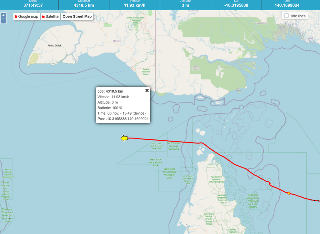 Il a pas traîné, on voit sur son nouveau tracking qu'il est bien de l'autre côté du détroit de Torrès.