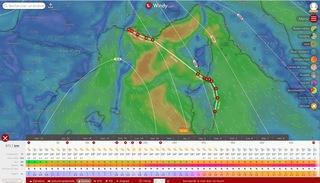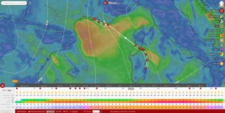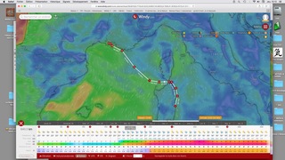 sur Windy.com, premium, Ordi OsX 10.13.6, j'apprends à utiliser le "Planificateur d'itinéraire" (clic droit/Distance et planification).