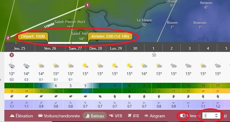 Par exemple aujourd'hui mercredi 24 septembre, c'est le départ que donne Windy (date du jour) alors que je souhaiterais débuter l'affichage au 2 octobre midi. Si l'ensemble de la route est bonne en distance, c'est le réglage de la date de départ qui m'échappe.
