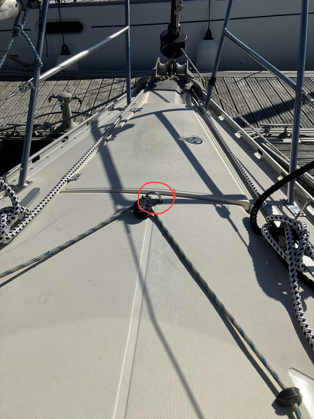 Bonjour, à ceux qui connaissent bien les Sunshine 36 ou 38. Voir la photo ci-jointe. Que pensez-vous de cette cadène situé juste derrière la baille à mouillage et qui est habituellement utilisé pour le Hale bas de Tangon : peut-elle être utilisé pour y mettre une voile d’avant de surface plus petite avec une étai textile larguable?
