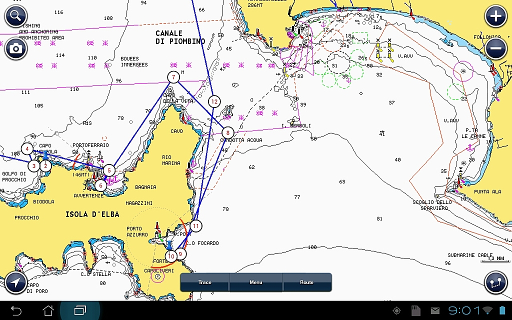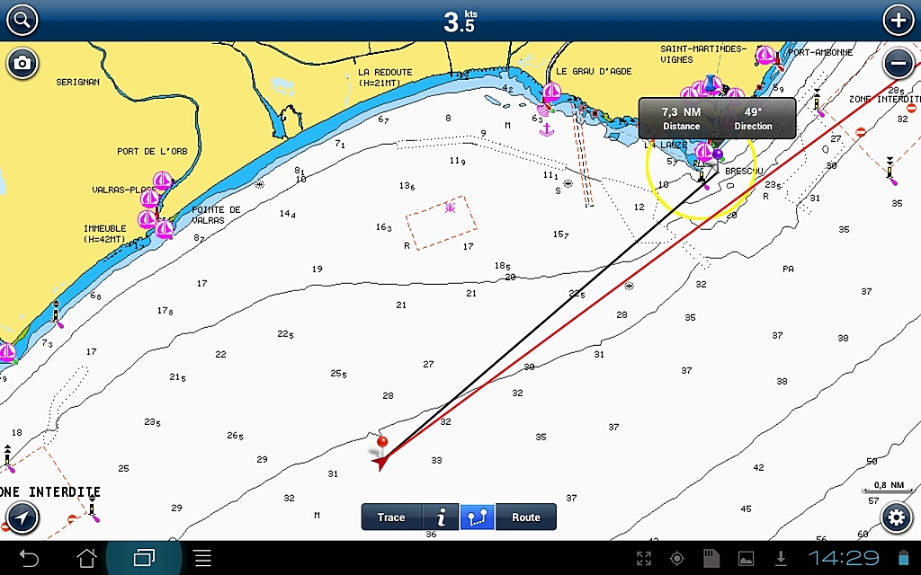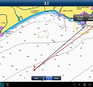 1 : capture d'écran en nav ( avec position gps et vecteur cap en rouge )
