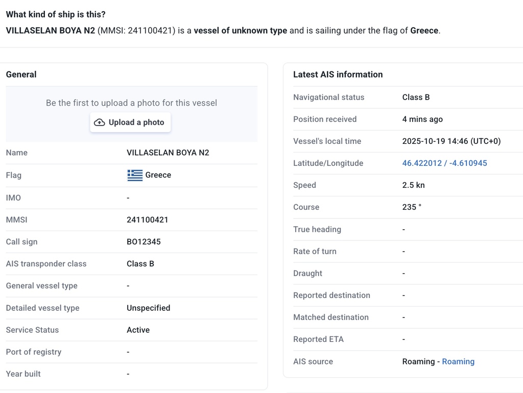 courtox56:As tu remarqué la couleur utilisée pour visualiser ce type d'émetteur, le Gris ...cela va intéresser la Douane, ce signal AIS supposé statique qui se déplace à 6 nds avec un cap constant. Le signal AIS est capté par le bateau de pêche qui diffuse cette position vers Marinetraffic.com en Roaming, par contre les bateaux autour doivent le "voir" sur leur écran à 1 à 2 milles maxi en ce moment avec les 3 m de houle. ·le 19 oct. 17:29