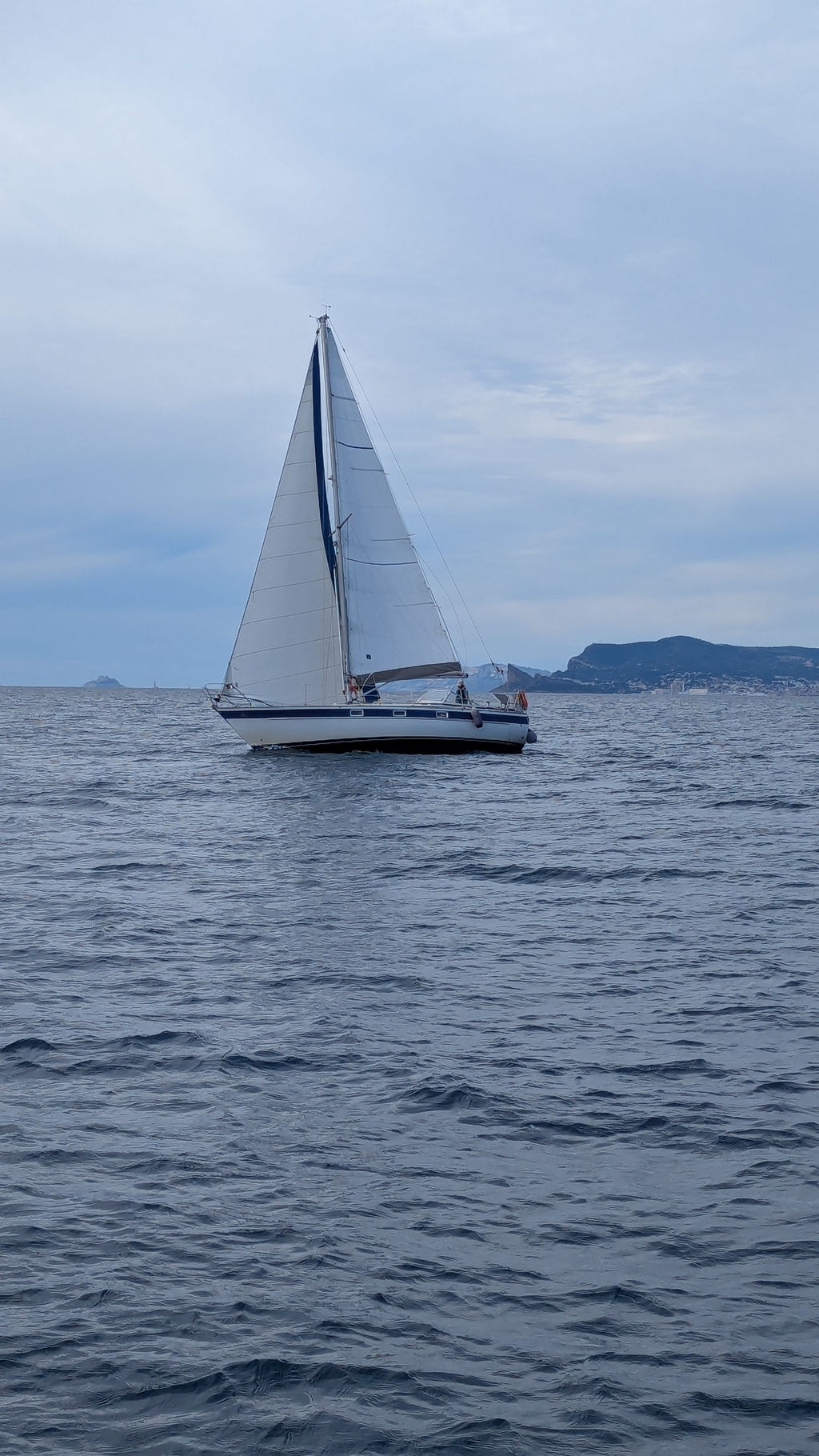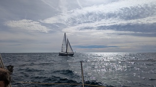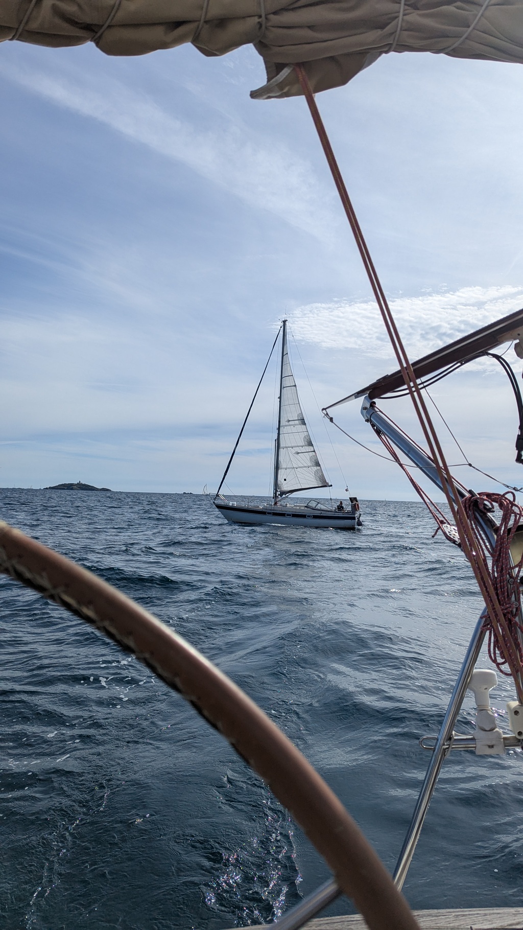 Vers la sortie de la baie, avant les magnons, le tri nous avait rattrapé sur le point de nous doubler. Pour éviter cet affront, on change la règle et "on vire!" 😁🤣 Nous voilà partis a la rencontre de Sinbad (J PH ) qui arrive de Sausset...
