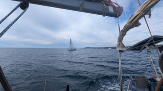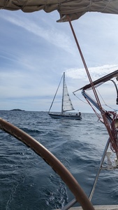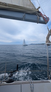 Nous sommes partis devant au près et le tri nous prend en chasse une centaine de m derrière.