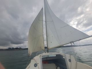 le mat est plutôt haut pour un bateau de cette taille ,, et malgré son poids , il navigue plutôt bien ( bon ,,, il fait des bords carré !!! )