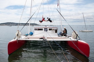 C'est un des trois formule 40 construit par Jeanneau la première année de la création de cette jauge. L'un est aujourd'hui à Bora Bora et fait du day charter repeint en jaune, le deuxième (fleury michon) a failli être détruit. Racheté par Jacques Vapillon (photographe de voile), il se trouve toujours aujourd'hui à La Trinité où il ne navigue pas. Le dernier est celui que vous voyez mais le programme de bateau spectacle n'a semble t-il pas marché et le bateau est à nouveau à terre.