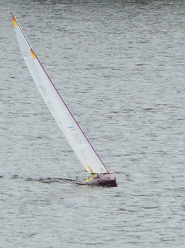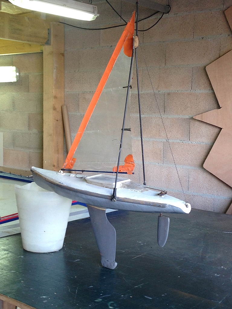 Soucis majeur, elle est à l'échelle avec une quille longue classique, et se vautre en dérapant à la première risée... plus pour longtemps, puisque qu'après cette photo prise il y a une semaine, j'ai décapité la quille (en ABS) et triplé le tirant d'eau.