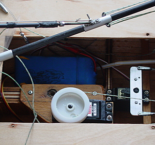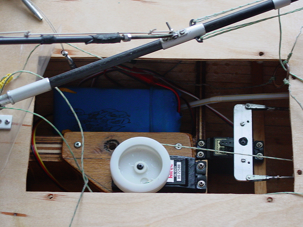 Un gros plan de la mécanique: un servo-treuil pour les écoutes (qui sont jointes en une seule, foc bomé auto-vireur), un servo avec palonnier pour le safran, détail de la bome et du hale-bas (ou plutôt pousse-bas).