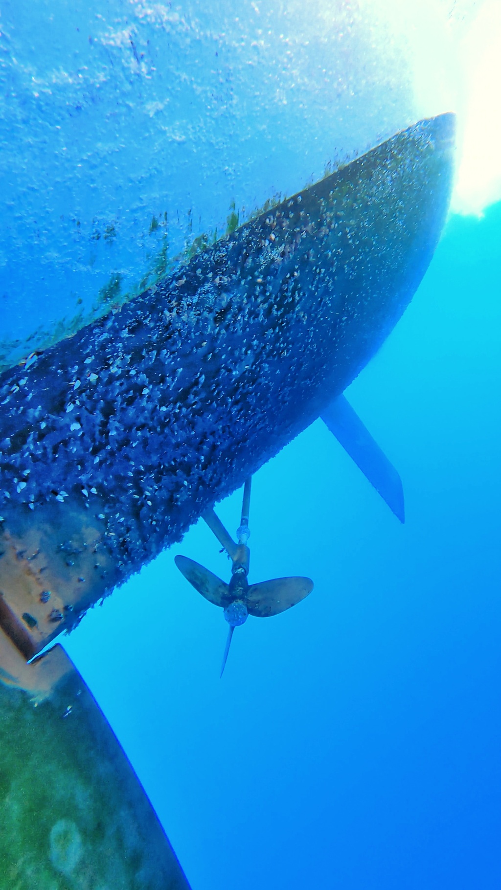 On a dû nettoyer la coque en plongée aux Galapagos car il y avait quelques concrétions ( carénage fait à Grenade)