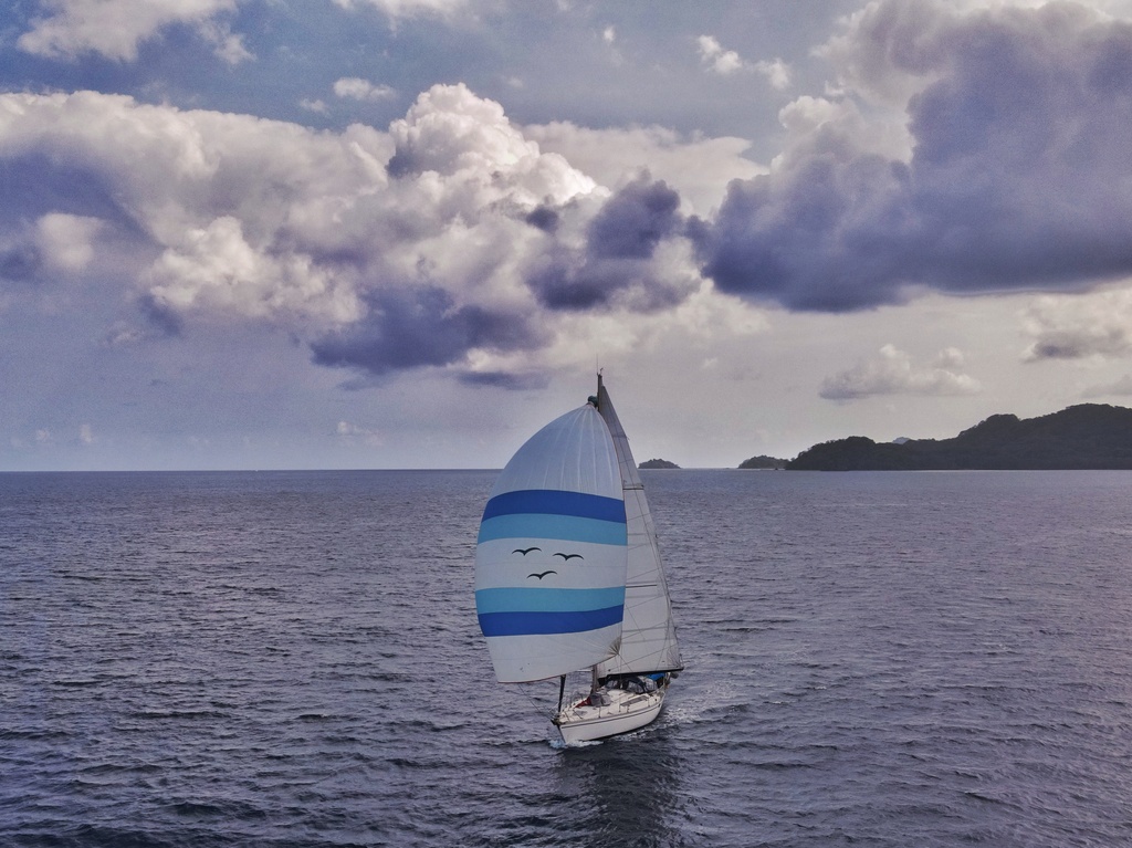 Le Petit prince étant en gwada,mon Oncle s'en est jamais servi, de plus il en avait en meilleur état a bord, et lors de notre départ de pointe a pitre après la naissance de notre bébé mon oncle m'a passé ce spi en me disant de ''l'éclater'' pendant notre nav car il était rincé et que ça lui ferait une belle fin de vie ! .... Se qui a été le cas lors d'un grain de nuit aux 2/3 du trajet..