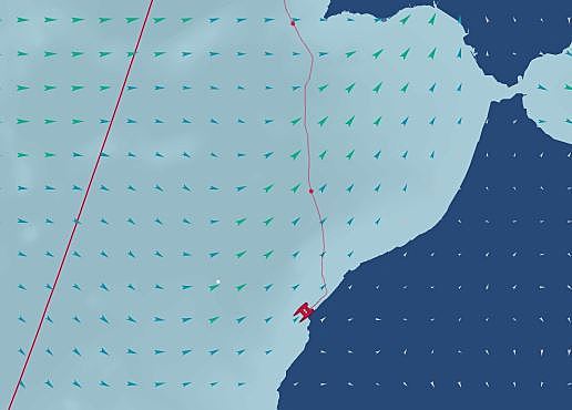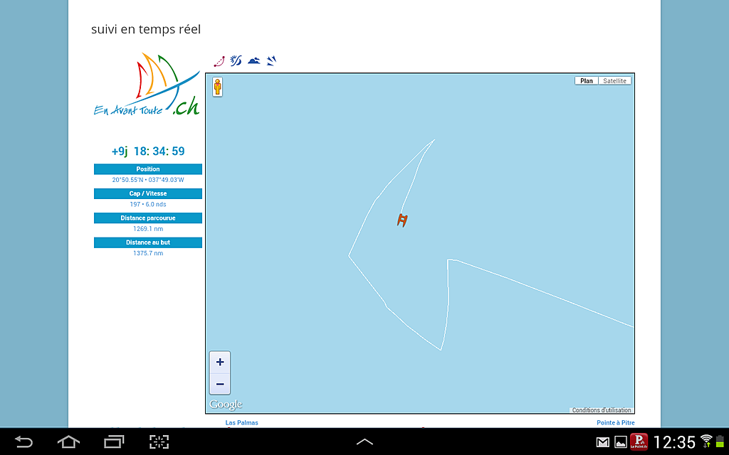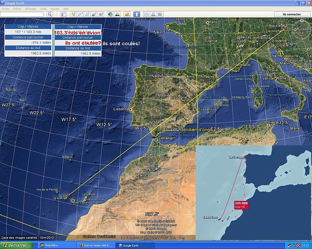 Yvan m’annonce qu’il va bien, mis à part que son mat est fissuré dans sa partie supérieure, ce qui empêche l’utilisation du spi et le déploiement complet de la grand voile.