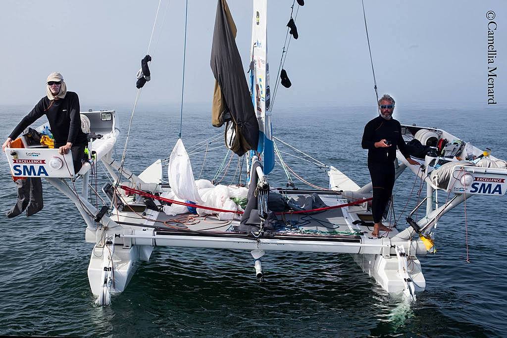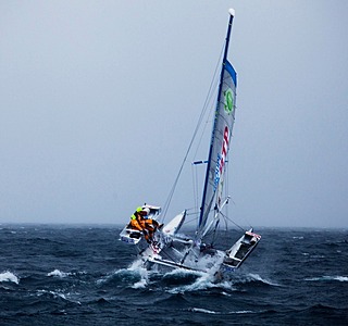 le fait de ne pas manger et de ne pas boire suffisamment... on a fini en hypothermie pendant 24 heures, malgré la chaleur extérieure. Nous étions enroulés tous les deux dans un spi et on s'est protégés comme on a pu, la chance a voulu qu'on n'ait pas chaviré à ce moment là, car nous aurions été dans l'incapacité de faire redresser le bateau, on était vraiment inertes, physiquement éteints. Il faut bien garder en tête qu'à à la différence d'Yvan sur son tour du monde , nous étions dans une notion de record, et si ça n'avait pas été le cas, je pense qu'on se serait posés, et on aurait attendu que les choses se calment.