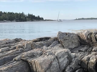 À l'ancre dans le Casco Bay, près de Portland Maine. Certaines des îles sont les parcs de la ville.