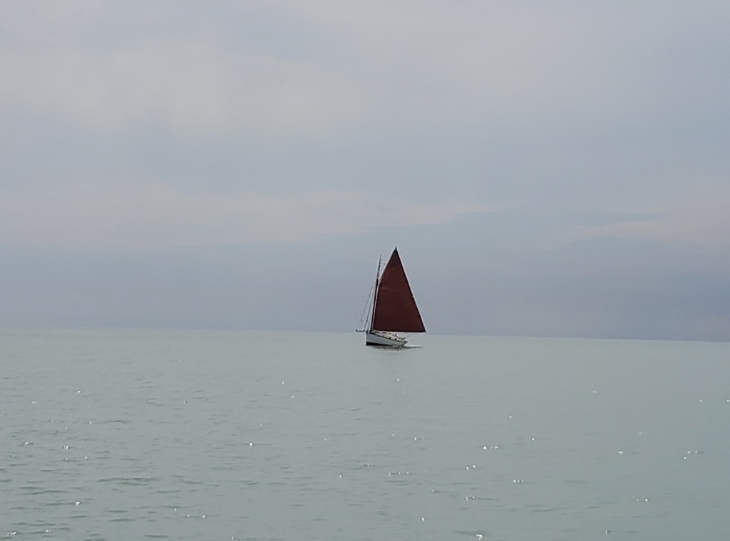 Petite voile rouge croisée sur mer de lait